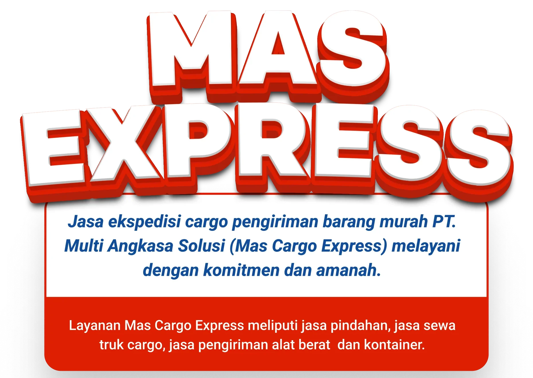 Jasa ekspedisi cargo pengiriman barang murah PT. Multi Angkasa Solusi (Mas Cargo Express) melayani dengan komitmen dan amanah. Layanan Mas Cargo Express meliputi jasa pindahan, jasa sewa truk cargo, jasa pengiriman alat berat dan kontainer.